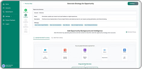 Upload CRM information, internal documents, call records, and competitive intelligence repositories via the upload functionality (available today) during creation of an opportunity, with seamless integration with existing opportunity and account management systems (Coming Soon!)