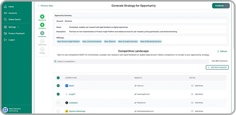 This capability enables sales professionals to build data-driven, strategic approaches to complex B2B sales by leveraging AI-powered insights, comprehensive stakeholder mapping, and intelligent competitive analysis.
